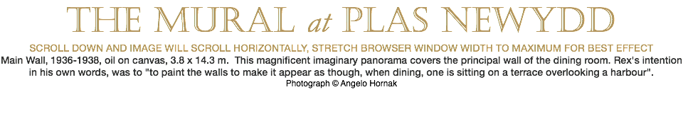 Main Wall, 1936-1938, oil on canvas, 3.8 x 14.3 m. This magnificent imaginary panorama covers the principal wall of the dining room. Rex's intention in his own words, was to "to paint the walls to make it appear as though, when dining, one is sitting on a terrace overlooking a harbour".